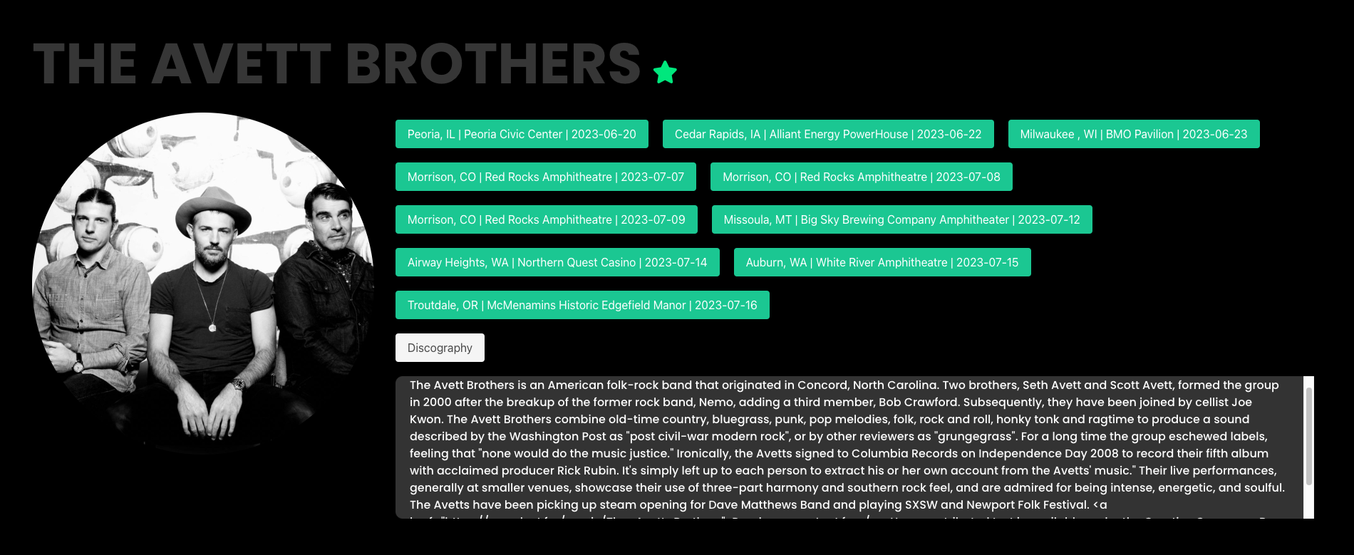 Groupie is a one-stop-shop for checking out your favotite bands and musical artists. Just enter the artist in the search bar, and you will get their next ten tour dates (which you can add individually to favorites), an extensive bio, their discography, picture, and option to add them to favorites (star).