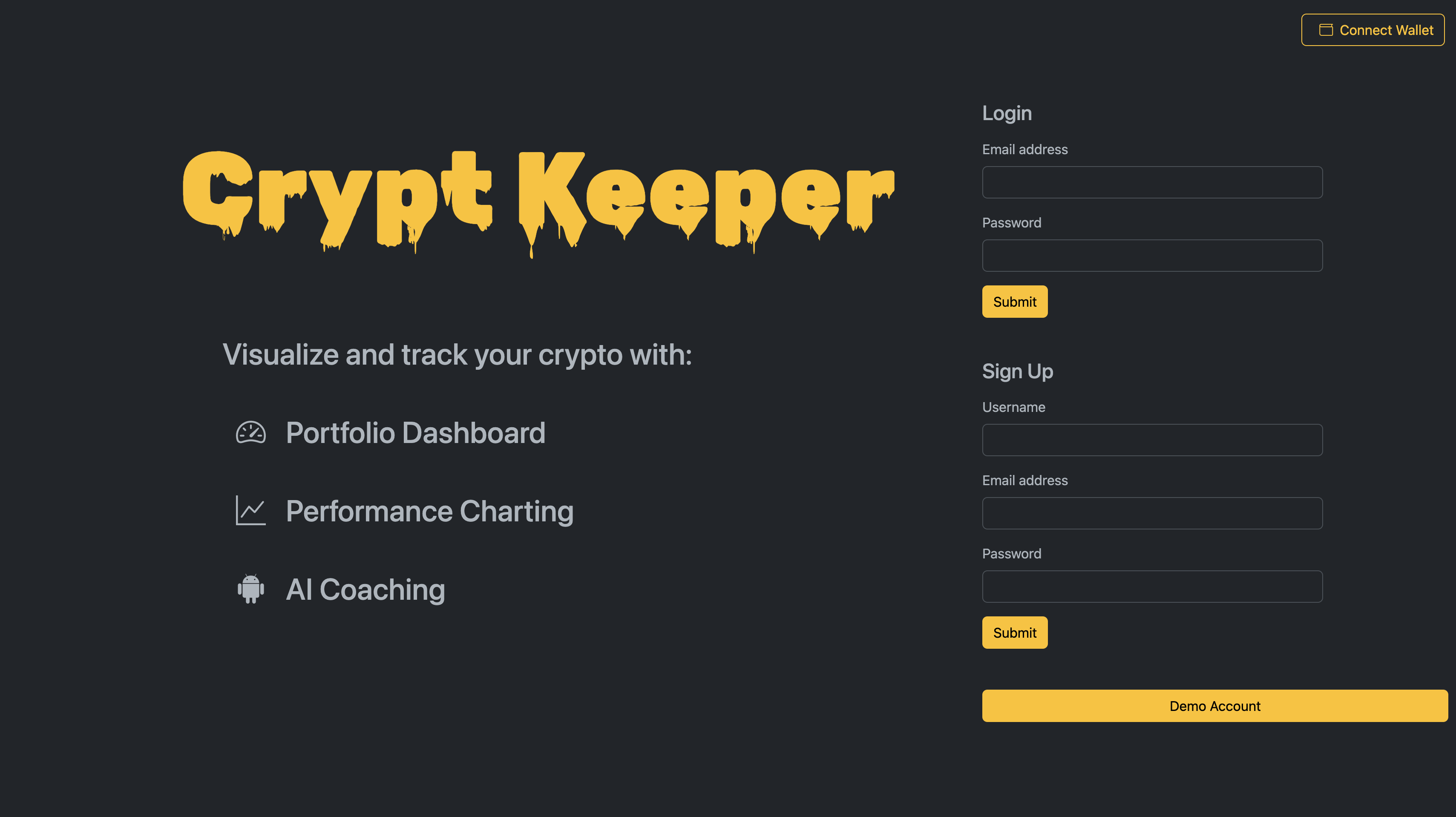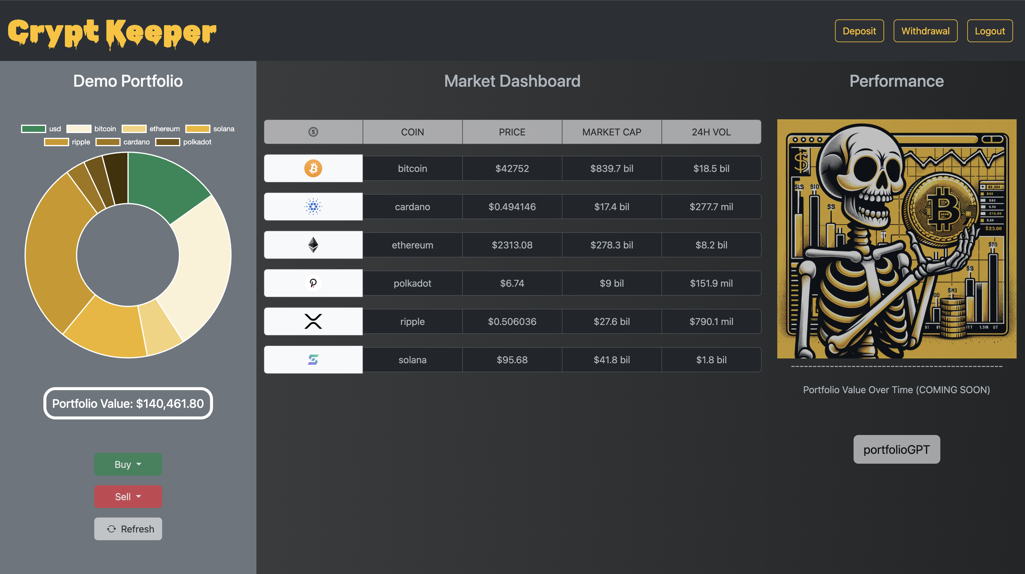 Crypt Keeper is a cryptocurrency portfolio simulator, and is a full-stack application. Buy and Sell the top ten crypto coins, and see how your porfolio can do over time (without risking real money). You can also get advice and forecast on your porfolio using our portfolioGPT feature!